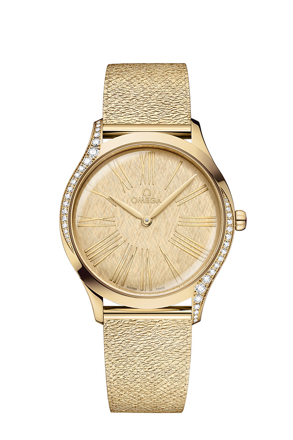 La montre est dotée d’un bracelet milanais en or Moonshine 18K estampillé d’un motif rappelant la soie avec une boucle déployante particulière. Elle est entraînée par le Calibre OMEGA 4061, dissimulé par un fond de boîtier métallisé en verre saphir effet miroir orné du motif « Her Time ».