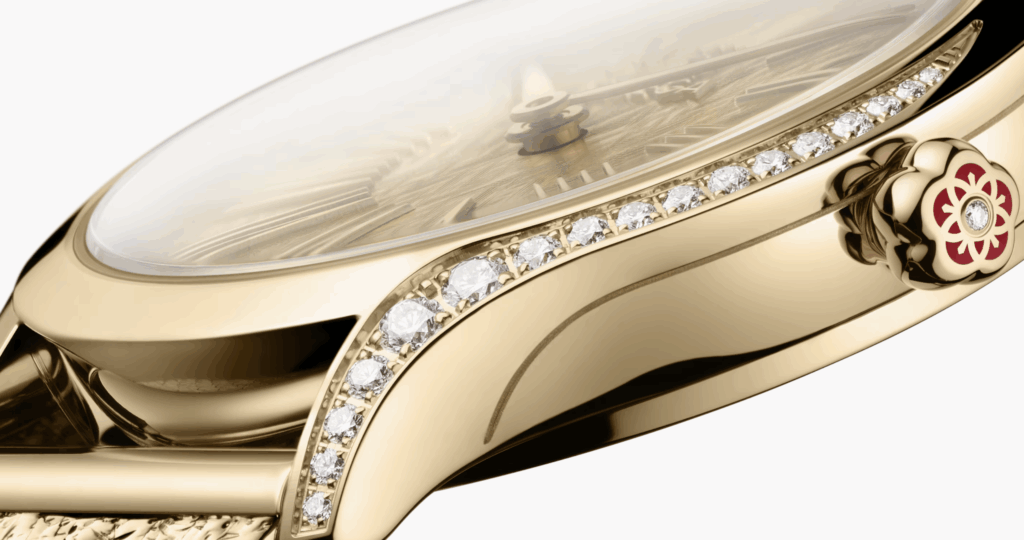 Elle arbore un boîtier de 26 mm en or Moonshine 18K, serti de diamants suivant délicatement les courbures de chaque côté. Un diamant unique orne la couronne, entouré d’une fleur en céramique liquide rouge. Le cadran bombé est réalisé en or Moonshine 18K et présente un motif rappelant la soie où contrastent les aiguilles polies au diamant et les chiffres romains frappés.