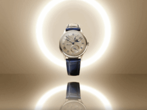 Elle arbore un boîtier de 26 mm en or Moonshine 18K, serti de diamants suivant délicatement les courbures de chaque côté. Un diamant unique orne la couronne, entouré d’une fleur en céramique liquide rouge. Le cadran bombé est réalisé en or Moonshine 18K et présente un motif rappelant la soie où contrastent les aiguilles polies au diamant et les chiffres romains frappés.